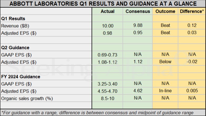 雅培预测Q2诊治后EPS为1.08-1.12好意思元,低于阛阓预期的1.12好意思元。不外,雅培将2024年全年有机销售额增长指令区间(不包括新冠肺炎检测关联销售额)从之前的8.0%-10.0%上调至8.5%-10.0%。