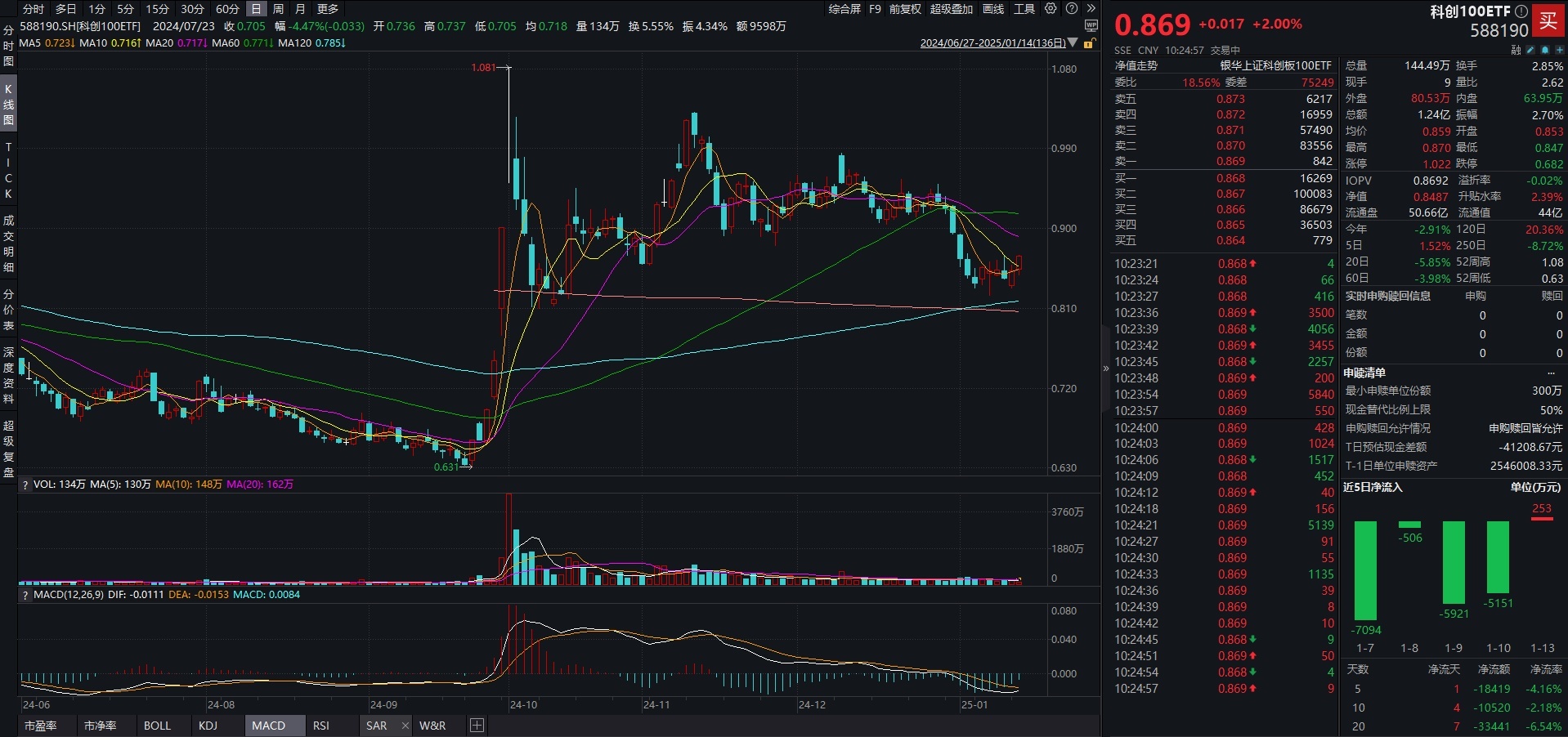 科创100ETF(588190)精采追踪科创100指数。该指数是从上海证券交易所科创板中考取市值中等且流动性较好的100只证券动作样本,以反应科创板市集不同市值领域上市公司证券的合座发扬。